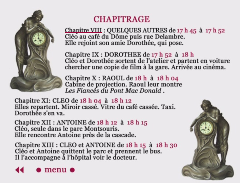 «le film n'a pas été écrit comme un scénario, traduit ensuite au cinéma. J'essaie de travailler bien en désordre, car j'aime que la focale d'un objectif précède parfois dans ma pensée une figure,j'aime aller du site à la situation, du travelling au tourment, du tempo d'un découpage à une pensée, j'essaie d'utiliser le vocabulaire plastique du cinéma avant que les idées sur le film ne se figent dans des mots» (Varda 1962). Elle affirme aussi: «tous mes films répondent à un élément de structure».