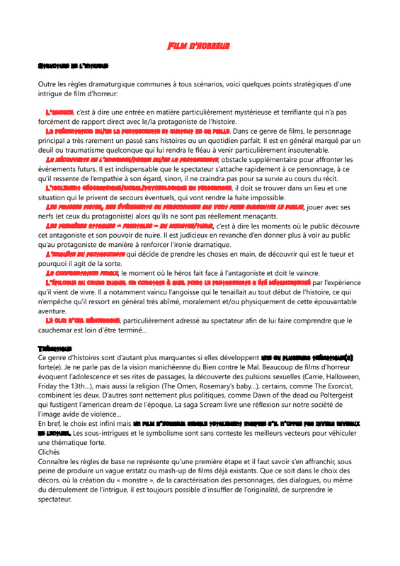 J'écris une scène d'exposition qui intègrent des motifs et thèmes du genre (deux pages maximum) avec mes intentions. J'apporte un extrait de film qui m'a inspiré ey que je présente au groupe.