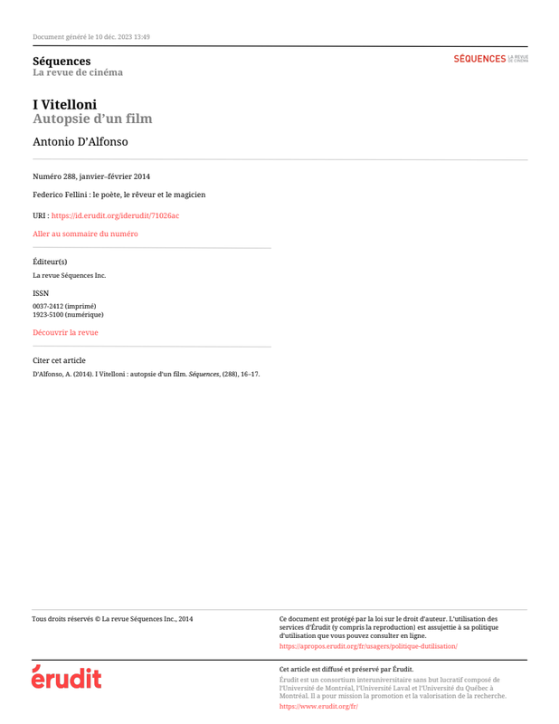» Les « gros veaux » de Fellini, eux non plus, ne veulent pas changer d’état – à l’exception du jeune Moraldo, le moins usé, le moins corrompu des cinq. Leur animalité, encore discrète si on la compare aux femmes-baleines et autres hommes-oiseaux qui peupleront le cinéma fellinien à venir, leur est une province, et beaucoup davantage. Ils n’en sortiront donc pas. Quand Ulysse disait à Polyphème : « Mon nom est personne », c’était une ruse pour triompher. En revanche, quand Alberto se lamente en déclarant « nous ne sommes personne ! », il dit simplement la vérité…
